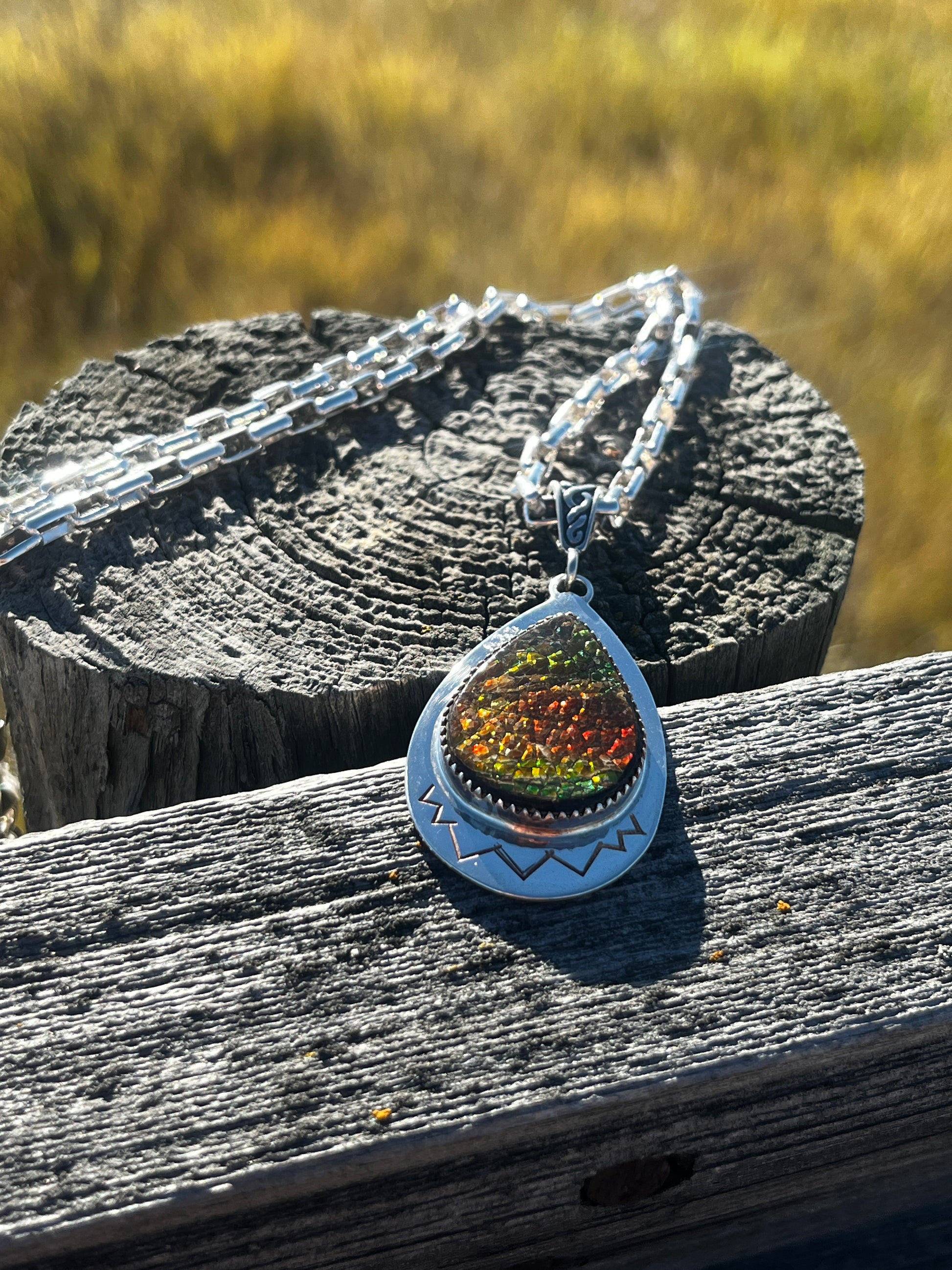 This ammolite pendant measures 2 1/4" x 1". The sterling silver chain is 18" in length and 5mm in width.