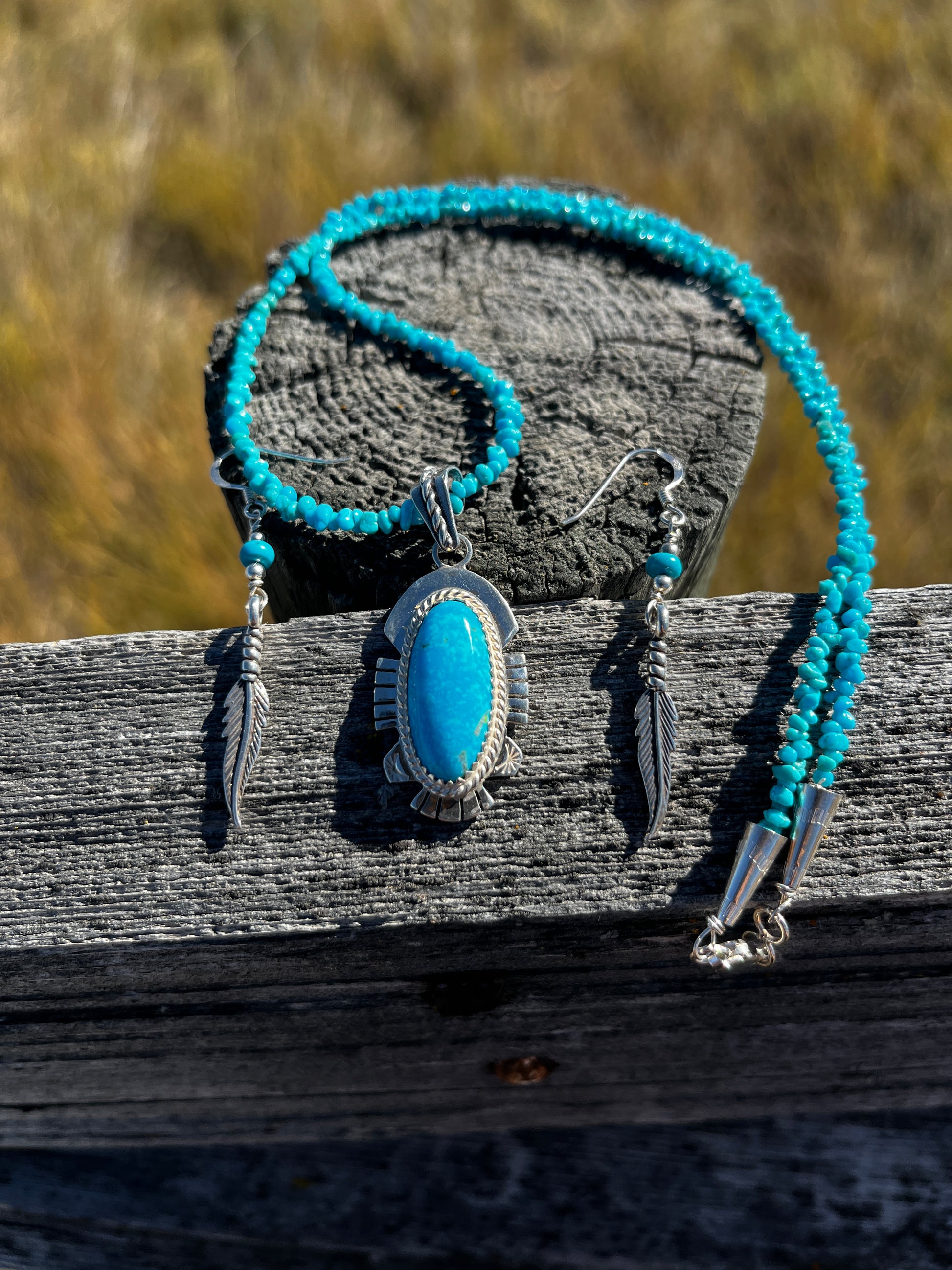 This necklace features a Kingman turquoise chain with sterling silver closure. The length is 22" long. The pendant also features a Kingman stone that was hand cut, shaped and polished by the artist. The pendant measure 1 1/2" x 3/4"